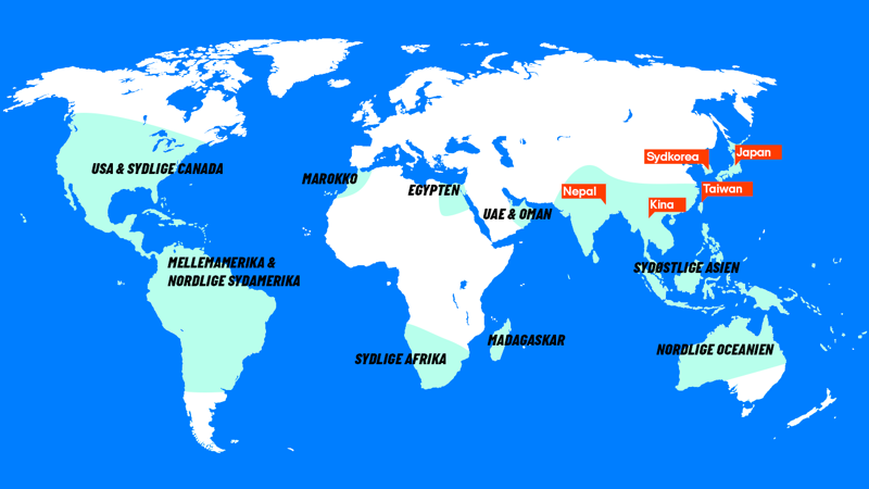 NB: De røde bokse viser en række destinationer, som vi gerne vil fremhæve som nogle helt særlige steder at rejse til i april - de er beskrevet nedenfor. Derudover viser de lyseblå markeringer overordnede områder, som som også kan være gode rejsemål i april.